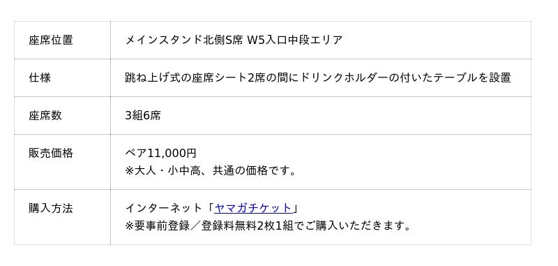 ペアシートは、昨年7月、雨や直射日光(※)を避けることができる屋根付きのメインスタンド北側エリアに新設した企画シートです。席と席の間にテーブルが付き、ドリンクやフードなどを置くことができるので、ご家族やカップル、ご友人、親子でのご観戦におススメです。
