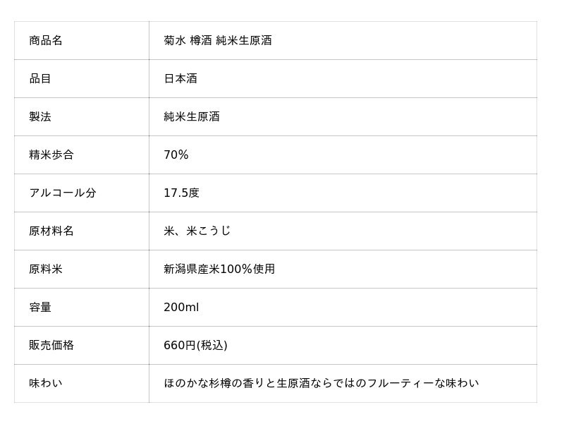 1.数量限定「菊水 樽酒 純米生原酒」200ml毎年ご好評いただいていた菊水ブースの樽酒。今年は「純米生原酒」の樽酒をアルミ缶に詰めてお届けします。いつもとはひと味違う特別仕様の樽酒をご堪能ください。