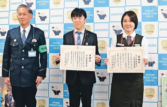 富山中央署は2日、警察官をかたる特殊詐欺の被害を食い止めたとして、富山開郵便局(富山市開、長谷博志局長)と同局課長代理の山田志津香さんに感謝状を贈った。