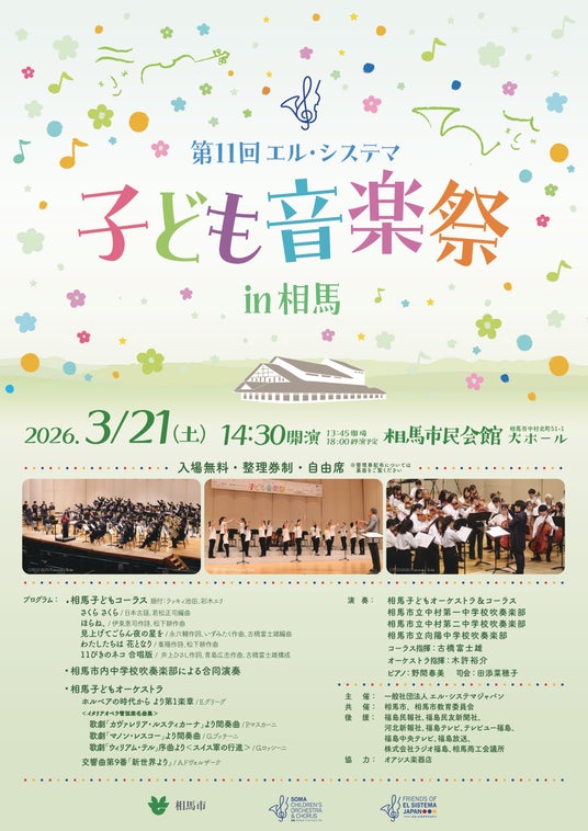 相馬子どもオーケストラ&コーラスは、2026年3月21日(土)に「第11回エル・システマ子ども音楽祭 in 相馬」を開催いたします。