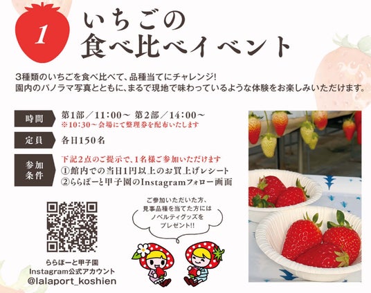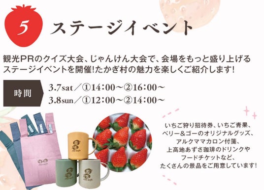 A. 一番の目玉は、たかぎ村産のいちご3品種(章姫、紅ほっぺ、ゆめのか)の「食べ比べイベント」です 。見事品種当てに正解した方には、ノベルティグッズをプレゼントいたします 。また、たかぎ村の「いちご狩りペア招待券」や「上高地あずさ珈琲のチケット」など、豪華景品が当たる白熱の「じゃんけん大会」も必見の注目企画です 。