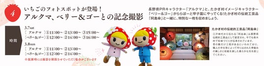 A. 長野県PRキャラクター「アルクマ」と、たかぎ村のイメージキャラクターで小学3年生の「ベリー&ゴー」が登場し、一緒に記念撮影を楽しめるフォトスポットをご用意しています 。背景には400年の歴史を持つ伝統的工芸品「阿島傘」を飾り、華やかな写真を撮ることができます 。また、いつでも参加無料で楽しめる「ベリー&ゴーの塗り絵ワークショップ」も開催しており、お子様連れでも一日中楽しんでいただけます 。