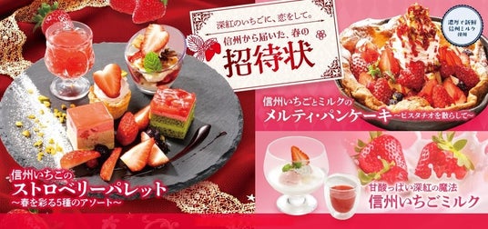 「上高地あずさ珈琲」の全13店舗にて、期間限定の「信州いちごフェア」を開催しております 。 オーブンで焼き上げた熱々のダッチベイビーに冷たいクリームとたっぷりの信州いちごを乗せた「信州いちごとミルクのメルティ・パンケーキ」 や、5種のスイーツを一皿で楽しめる「ストロベリーパレット ~春を彩る5種のアソート~」 など、春季限定の贅沢なスイーツをご用意して皆様をお待ちしております