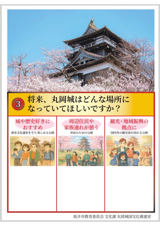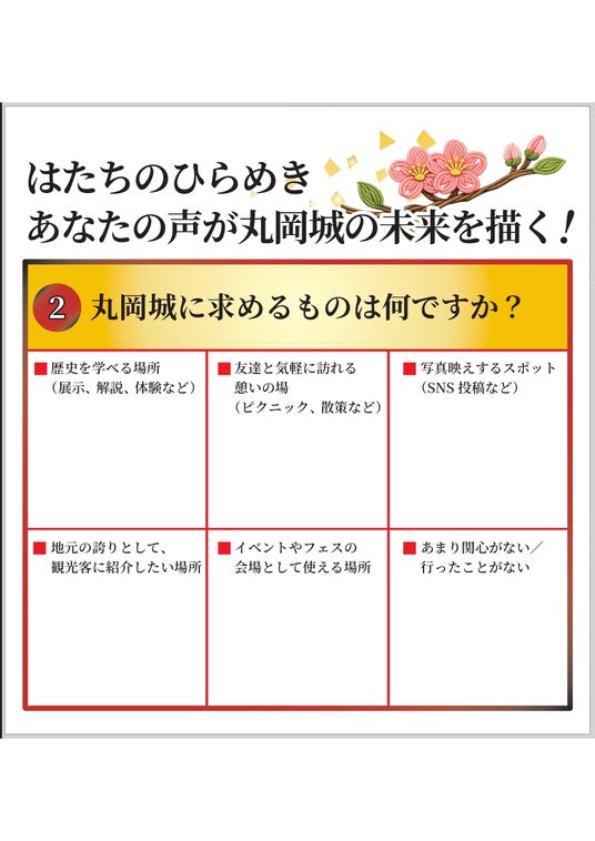 丸岡城は、重要文化財である現存天守を有しており、現在、天守のある城山整備に向け「丸岡城城山整備基本計画」の策定を進めております。今回の「はたちのつどい」では、市内の二十歳を迎える若者たちが一堂に会する貴重な機会を活かし、丸岡城への関心やイメージ、未来への期待を直接伺うアンケート調査を実施します。