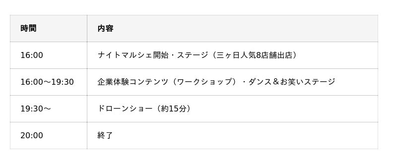 - 主なコンテンツナイトマルシェ(三ヶ日人気8店舗)/ダンス・お笑いステージ/企業ブース/ドローンショー