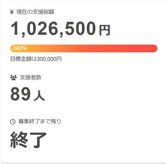 達成率342%、1,026,500円のご支援をいただきました。
