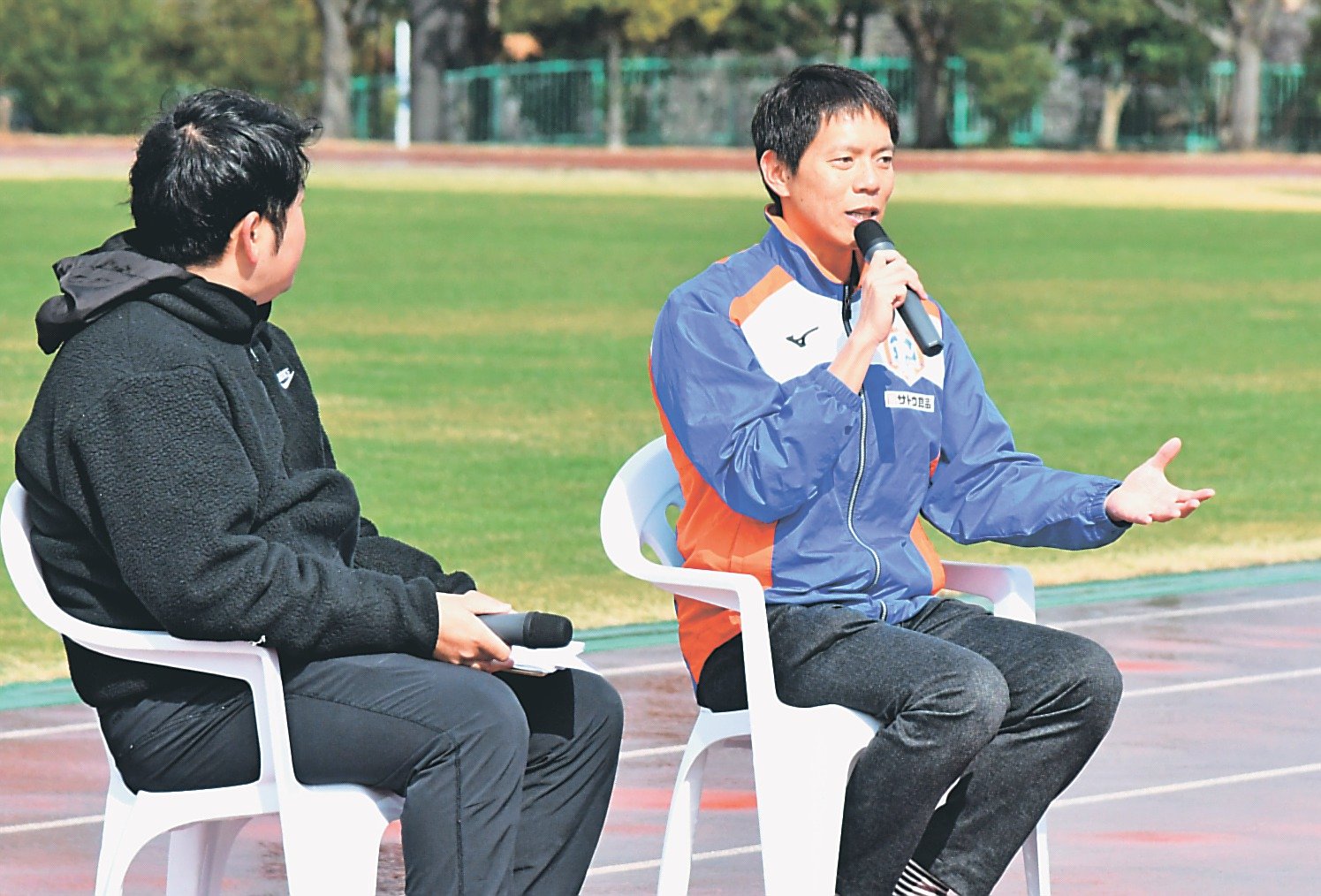 男子競歩で2019年世界陸上ドーハ大会金メダリストの鈴木雄介さん(38)の歩く速さを体感できるイベントが8日、富山市秋ケ島の県空港スポーツ緑地陸上競技場であり、子どもたちが世界レベルのスピードを間近で体験した。保護者向けのトークセッションでは、鈴木さんが競技に向き合う子どもとの接し方などについてアドバイスした。