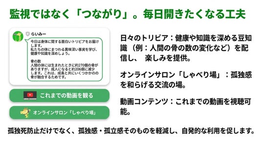 本サービスの特徴は、孤独死を防止するためだけの仕組みに留まらず、孤独感・孤立感の軽減に資する各種機能を備える点にある。日々の応答ややり取りの蓄積が「気づき」の根拠となり、必要な支援につなげやすくすることを狙う。