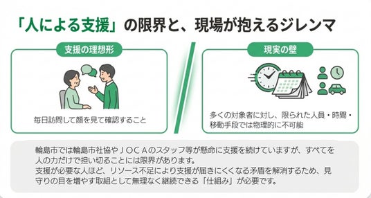 輪島市では輪島市社協やJOCAのスタッフを含め多様な担い手が見守りに関わっているが、対象者数・生活環境・移動負荷を踏まえれば、日々の確認を人の力だけで埋めることは困難である。そこで本協定では、人の支援を否定せず、むしろ人の支援を活かすために、平時の確認をICTで補完するという考え方を採用した。