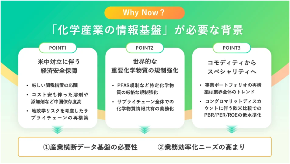 日本の化学産業は、世界でもトップクラスの技術と現場力を持っています。一方で、データ(≒情報)の扱い方だけが、まだ追いついていない。私たちはその“最後のピース”を埋めにいきます。そうすることによって、日本の化学産業が、もっと速く、もっと自由に、もっと前に進める状態をつくることを本気で目指しています。