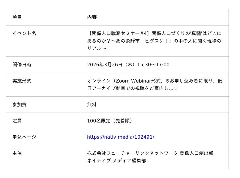 関係人口創出を推進する株式会社フューチャーリンクネットワーク(本社:千葉県船橋市、代表取締役:石井丈晴、以下FLN)は、2026年3月26日(木)に、自治体の関係人口・移住促進施策に携わる方を対象としたオンラインセミナー「【関係人口戦略セミナー#4】関係人口づくりの'真髄'はどこにあるのか? ~あの飛騨市「ヒダスケ!」の中の人に聞く現場のリアル~」を開催いたします。ゲストに、関係人口創出の先進モデルとして全国から注目を集める岐阜県飛騨市の「ヒダスケ!」を現場で動かしてきた事務局のながいしともき氏を迎え、FLN関係人口創出部 部長の佐宗勇志とともに、現場の実践知を掘り下げます。