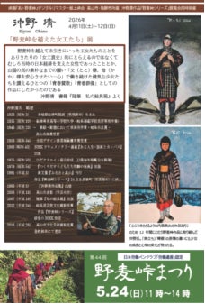 今回の映画上映と絵画展は、歴史的な野麦峠を広く知っていただき、地域の歴史を後世に伝えることを目的としています。また、毎年5月に開催される「野麦峠まつり」では、旧野麦峠を当時の女工姿の行列など、地域間(松本市奈川・高山市高根町)の交流や観光振興を図るものとなっています。