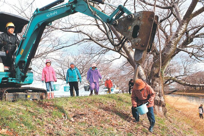 この日は、60~80代の約20人が参加。重機2台で木の周辺に穴を空け、肥料を入れた。由井久也会長は「少しでも長く桜を残し、多くの人にきれいな景色を楽しんでほしい」と話した。