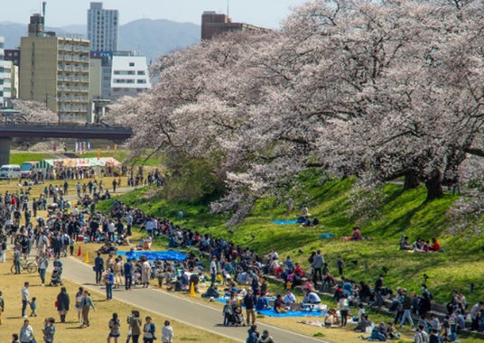 足羽川堤防に設置された屋外座敷「桜床(R)(さくらどこ)」では、桜を間近に感じながらお花見を楽しめます。日本一の呼び声高い「越前おろしそば」や、日本三大珍味のひとつである濃厚な「塩うに」などの福井グルメを、地元の銘酒とともに味わう贅沢なひとときをぜひ堪能してみては?