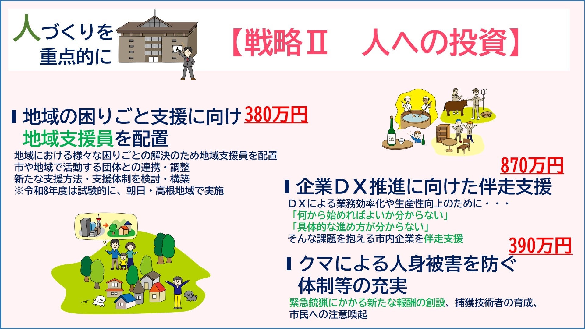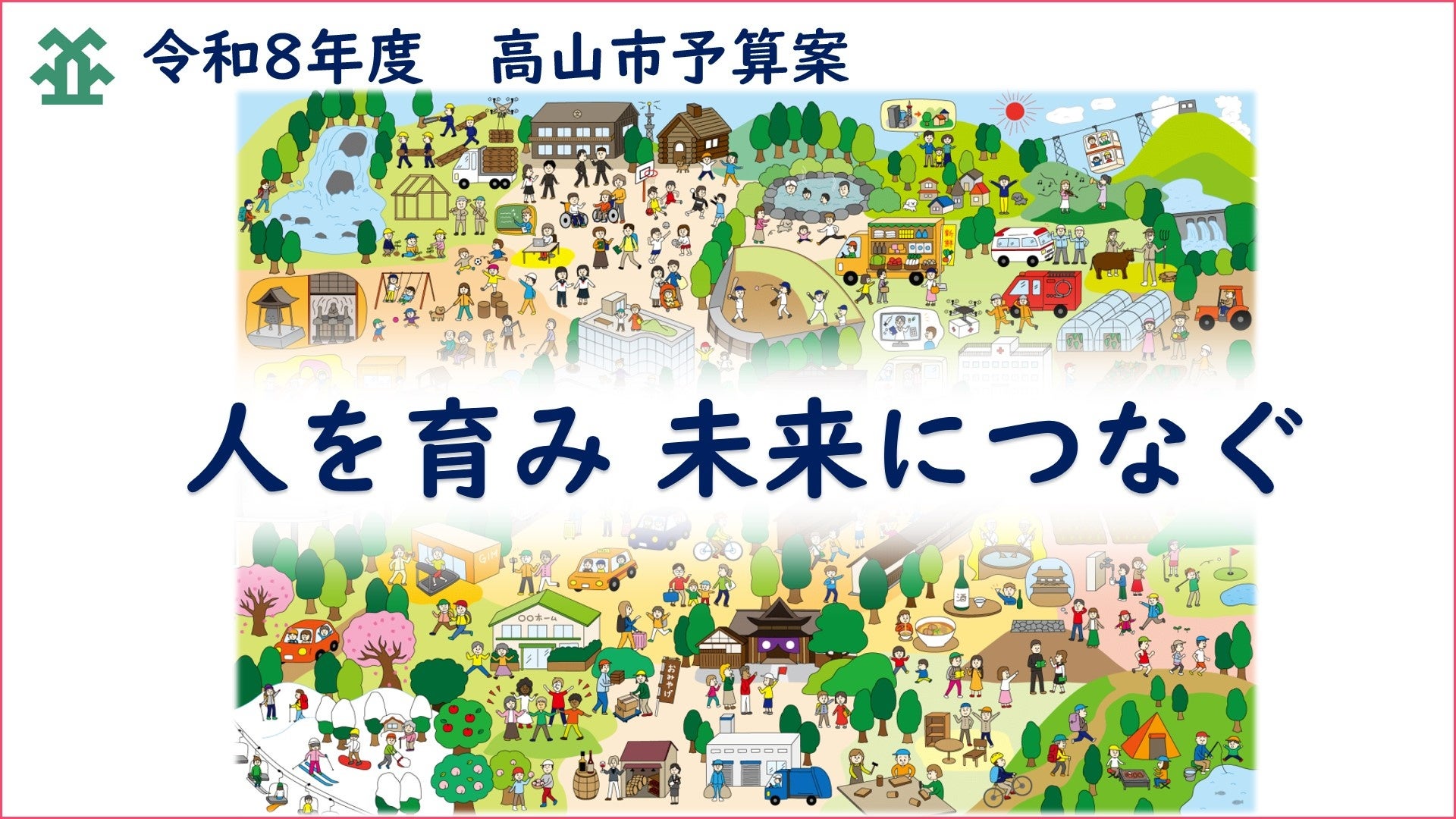 新年度予算案のポイント 市では「人を育み 未来につなぐ」という考え方をもとに、市民の皆さんが充実した毎日を過ごすことができるまちを実現するため、暮らしの中で課題となっている事柄の解決に向けて、できることから着実に実施していく予算を編成しました。