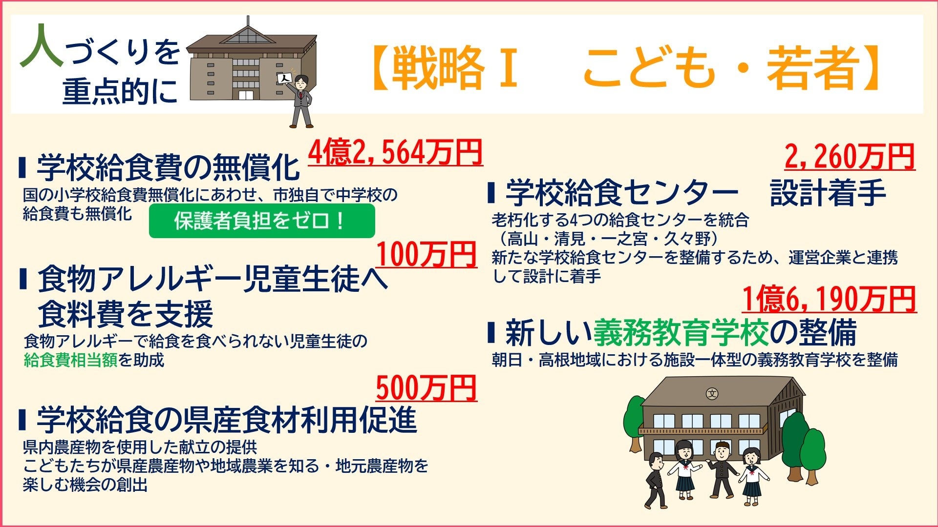 小学校給食費の無償化に加えて、中学校の給食費も無償化することで保護者の負担を軽減します。また、不妊治療で遠くまで通う方への交通費を助けたり、こどもが安心して遊べる屋内型の遊び場を整備したりして、将来を担うこどもを安心して生み育てやすい環境づくりに取り組みます。