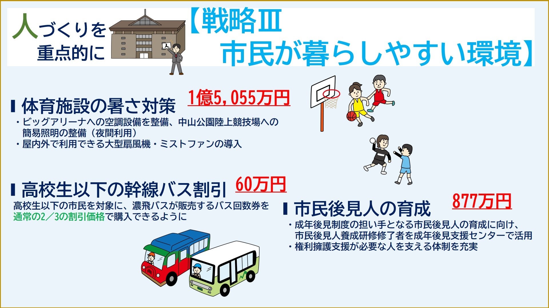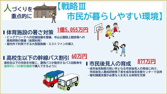 体育施設への空調設備整備などにより、安全で快適にスポーツ活動ができる環境づくりや高校生以下の幹線バス割引、成年後見制度の担い手となる市民後見人の育成による権利擁護支援が必要な人を支える体制の整備など、快適で安全な環境づくり、自分らしく充実して暮らせる環境づくりに取り組みます。