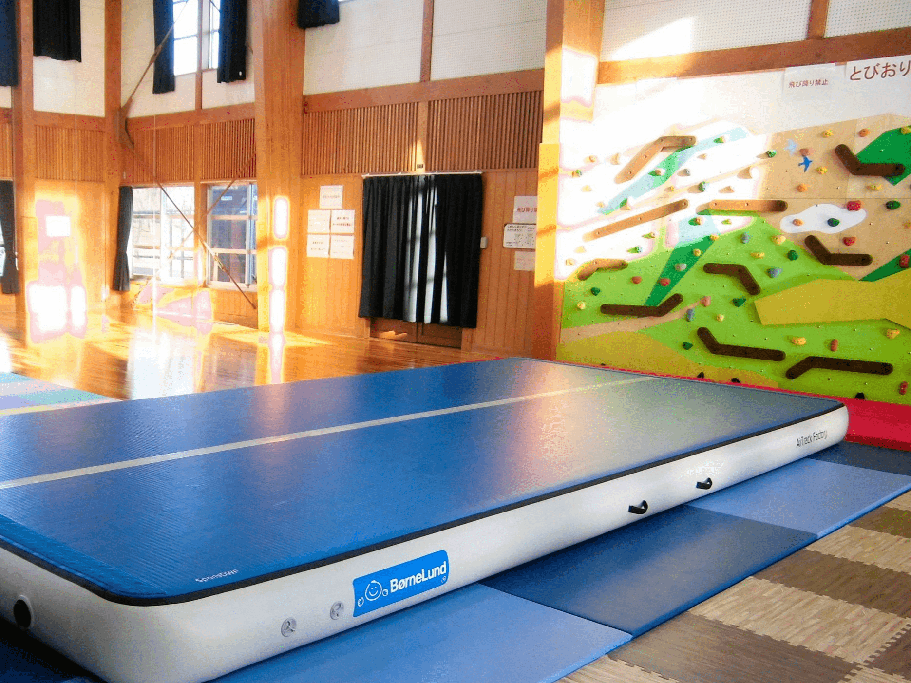 トランポリンのようなエアマットやボルダリング用の壁、空気で膨らんだ筒の中でゴロゴロ転がって遊ぶサイバーホイールなど、思いっきり体を動かせる大型遊具が充実。小さな子どもでも楽しめる小型遊具もそろえている。隣接している広場には複合遊具もあり、晴れた日は屋内外で切り替えて遊ぶこともできる。