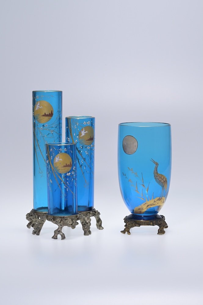 作品写真:(左)バカラ《台付花器「月に雁」》1878年頃、(右)バカラ《台付花器「月に鶴」》1878年頃 撮影:池田ひらく