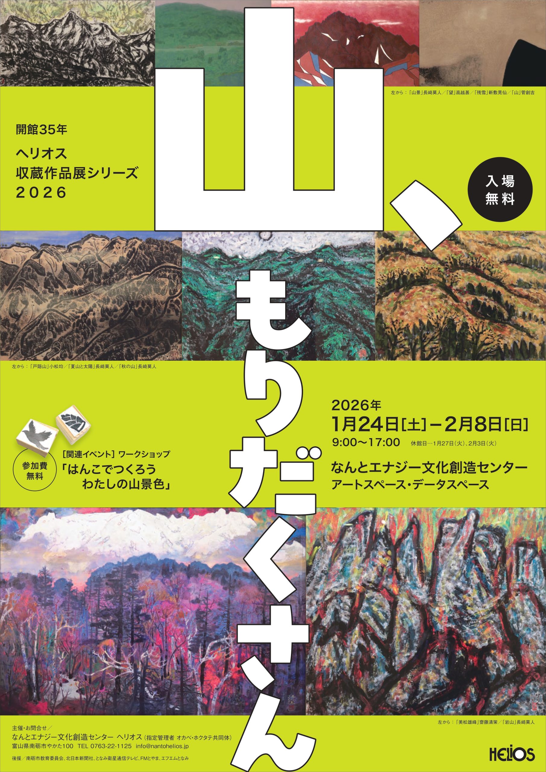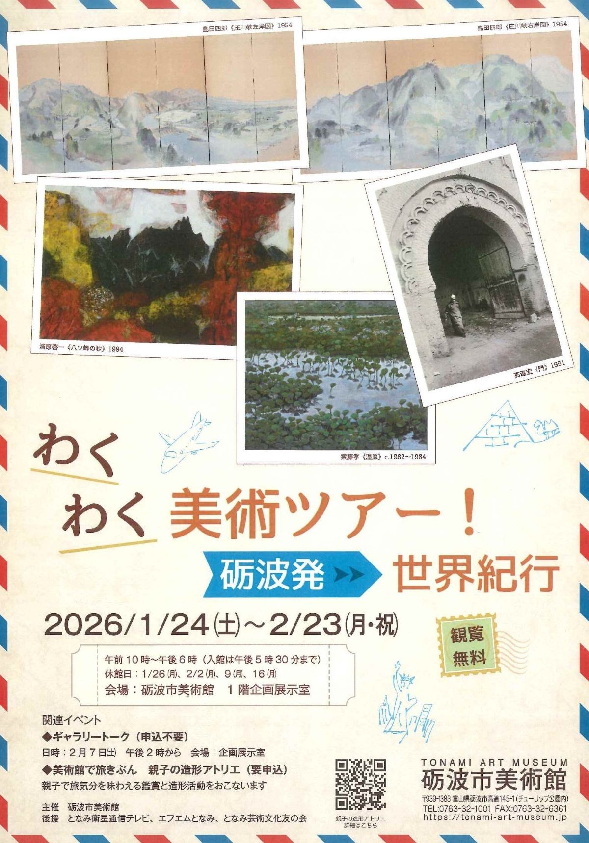 砺波市から県内、国内、アジア、アフリカ・ヨーロッパ、アメリカへ。作家が出会った風景を収蔵作品で巡る企画展。故郷の佇まいから自然や街並み、名所旧跡まで、多彩な景色を旅行気分で楽しめる展示構成となっている。