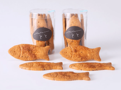 かわいらしい魚の形のクッキーは、4代目で代表の川岸有紀子さんが、射水市小杉地域の旧北陸道沿いの事業者とコラボし、2021年に開発。みそ・しょうゆ醸造業の片口屋(同市)の「鰤(ぶり)塩」を使用し、甘みとほのかな塩味のバランスが良く、しょうゆの香ばしさが味わい深い。パッケージなどのデザインは、アートユニット「風景と食設計室 ホー」(同市)が手掛けている。