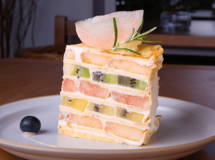 ナチュラルな雰囲気のカフェのショーケースには、見とれてしまうほど美しい手作りスイーツがずらり。中でも目を引くのが「フルーツミルクレープ」。どこを切っても断面がきれいに見えるように、均等な厚みに切ったフルーツを隙間なく敷き詰めている。薄いクレープ生地に軽い口当たりのクリームを合わせているので、ランチの後でもさっぱり食べられそう。