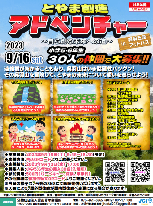 小学5、6年生を対象にしたアドベンチャーイベント。いま注目を集める呉羽山を舞台に「幻の滝」散策や新名所づくり(記念植栽)、バーベキューを体験。最後はキャンプファイヤーを囲んで、とやまの未来を語り合おう!