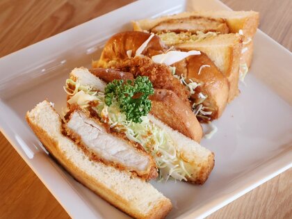 古民家を改装した店内は、温かみのある落ち着いた雰囲気。モーニングからカフェタイムまでゆったりくつろげる。ふわふわの食パンに分厚いとんかつを挟んだ「三元豚カツサンド」がおすすめ。