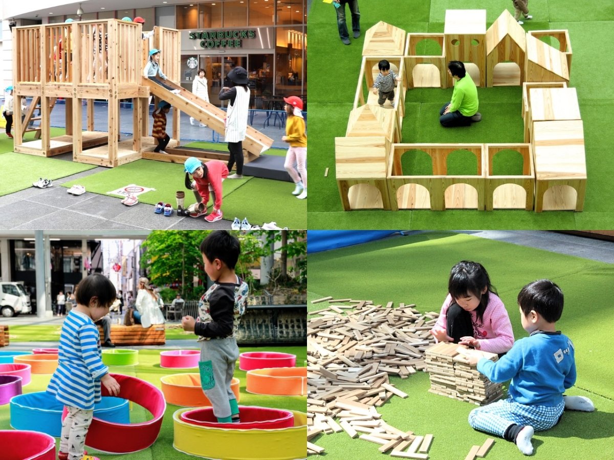 グランドプラザに天候を気にせず楽しめる子どもの遊び場が登場!すべり台ブランコなど4種類のアスレチック遊具のほか、自力で動くゴーカートや、乳幼児と保護者が遊べる遊具など、さまざまな遊具が設置される。
