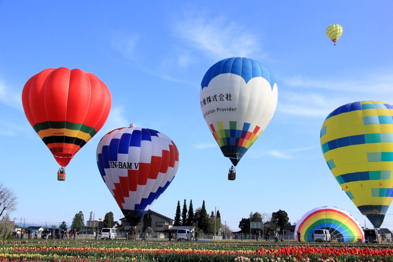 地上をカラフルなチューリップが彩る、春のとなみ野。緑の屋敷林が点在する散居村を見下ろしながら、色とりどりのバルーンが優雅に空中散歩する。一斉に離陸する熱気球群の迫力と、バルーンに染められた華麗な春空を、地上を彩るチューリップとともに楽しめる。