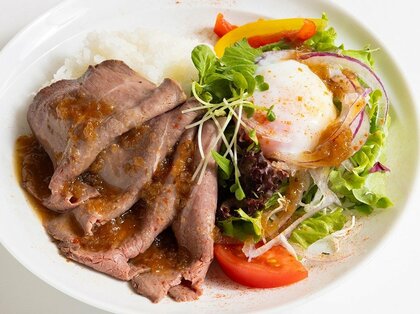 とろけるようなローストビーフに、南砺市産の濃厚な温泉卵や旬の野菜を添える「ローストビーフロコモコ」。女性客のニーズに応えて開発されたメニューで、見た目の美しさ、ヘルシーさにもこだわった。メニューは30種ほどで「リピーターの方が飽きないよう、バリエーション豊かにしています」と料理長の池田俊さんは語る。