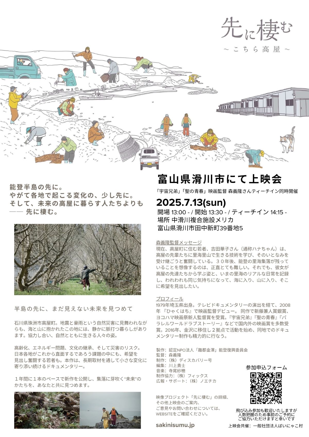 能登の文化的復興支援を目的とした、珠洲市高屋町に密着したドキュメンタリー映像の上映会を開催。上映後には、「宇宙兄弟」「聖の青春」などで知られる、森義隆監督によるティーチインイベントも行われる。