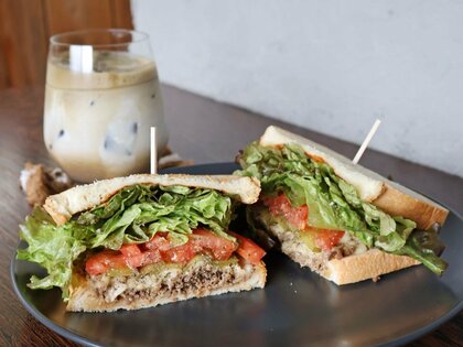一枚板のカウンターやペンダントライトが配された店内は、おしゃれで温かみのある雰囲気。倉庫だった建物をオーナーがDIY(日曜大工)で改装した。ひき肉やたっぷりの野菜を挟んだ「ミートマサンド」が一押しだ。