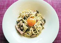 ベーコンとキノコのクリームパスタカルボナーラ風