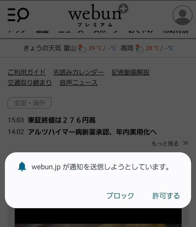 webunプラスを閲覧すると、下記のように通知の許可を確認するメッセージが表示されます。通知を受け取る場合は「許可」、拒否する場合は「ブロック」を選択してください。