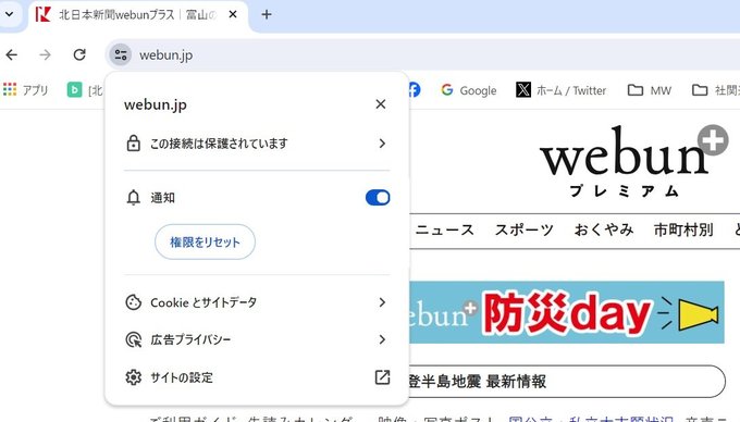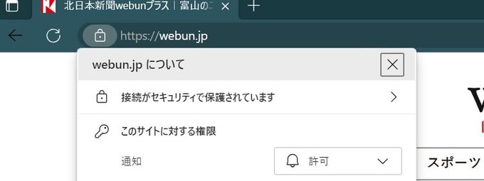 webunプラスにアクセスすると、アドレスバーの下に通知の許可を求める吹き出しが表示されます。