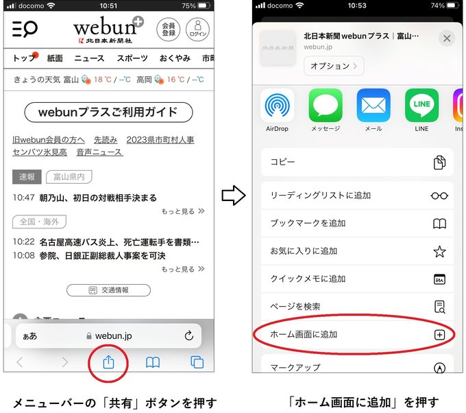 Safariブラウザでwebunプラスにアクセスし、画面下にあるメニューバーの「共有」ボタンから「ホーム画面に追加」を選んでください。