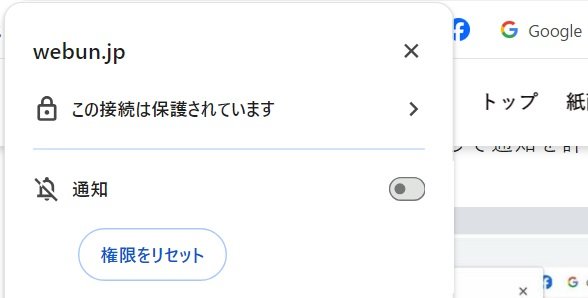 アドレスバーにある鍵マークをタップ(クリック)すると、下記のような画面が表示されますので、スライドバーを右に動かして通知を許可してください。
