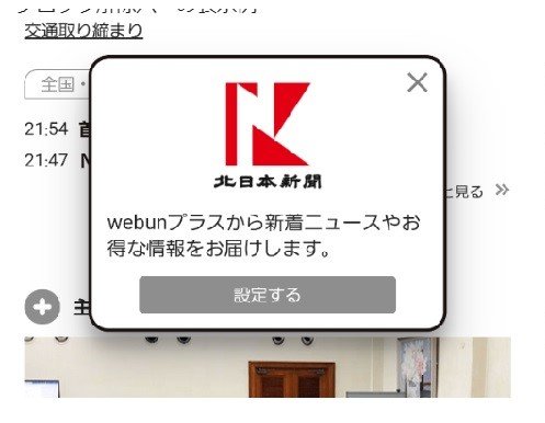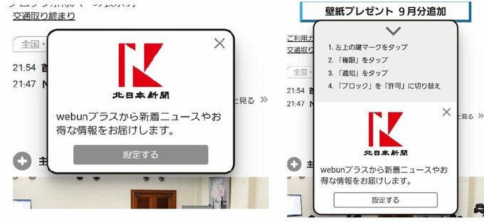 通知をブロックした場合、解除を求めるメッセージが一定期間経過後に表示されます。「設定する」ボタンを押すと、設定方法の案内が表示されます。通知が不要な場合は×ボタンを押してください。
