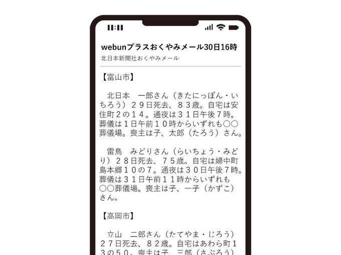 翌日の朝刊に載るおくやみ情報を1日3回に分けて配信